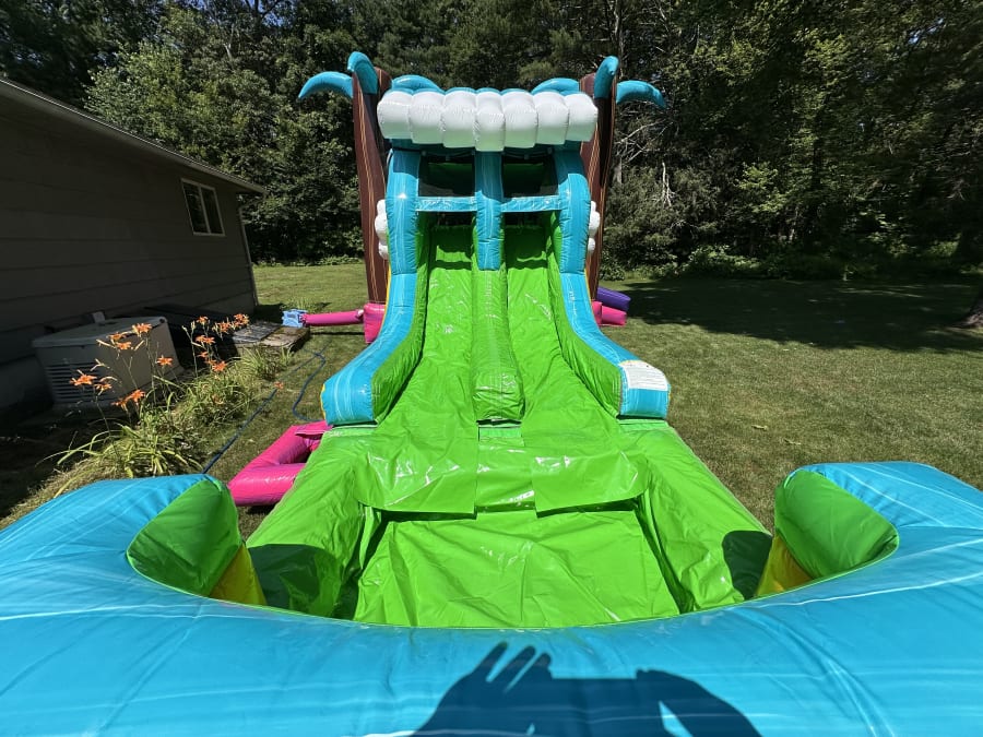 • 7 Activities in 1: Keep the party going with a bounce area, basketball hoop, obstacle pop-ups, climbing wall, and a thrilling wet or dry slide—all in one vibrant, tropical-themed unit.