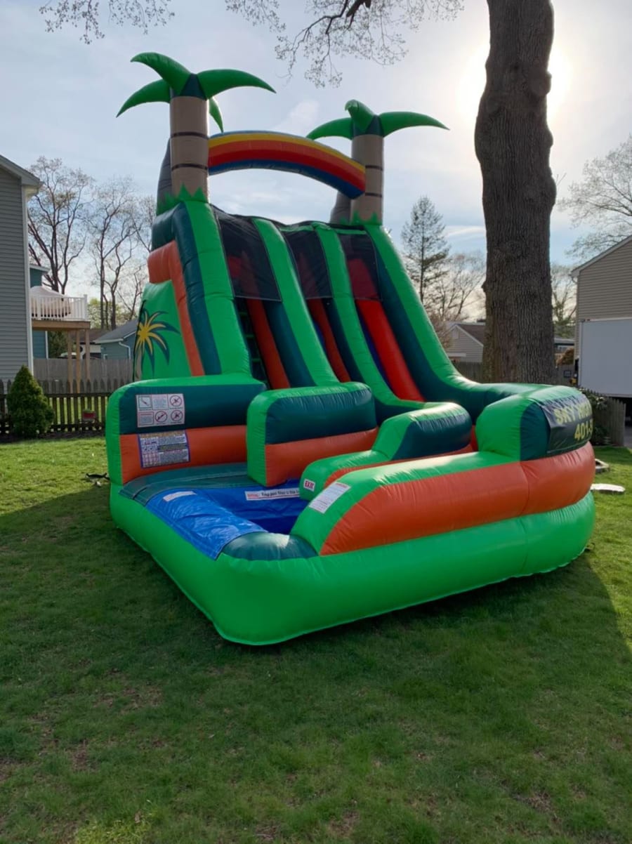 Don't miss out on the ultimate water adventure. Book the Super Tropical Dual Lane Water Slide for your next event and create memories that will last a lifetime. Contact us today to reserve your slide and get ready for a splashing good time!